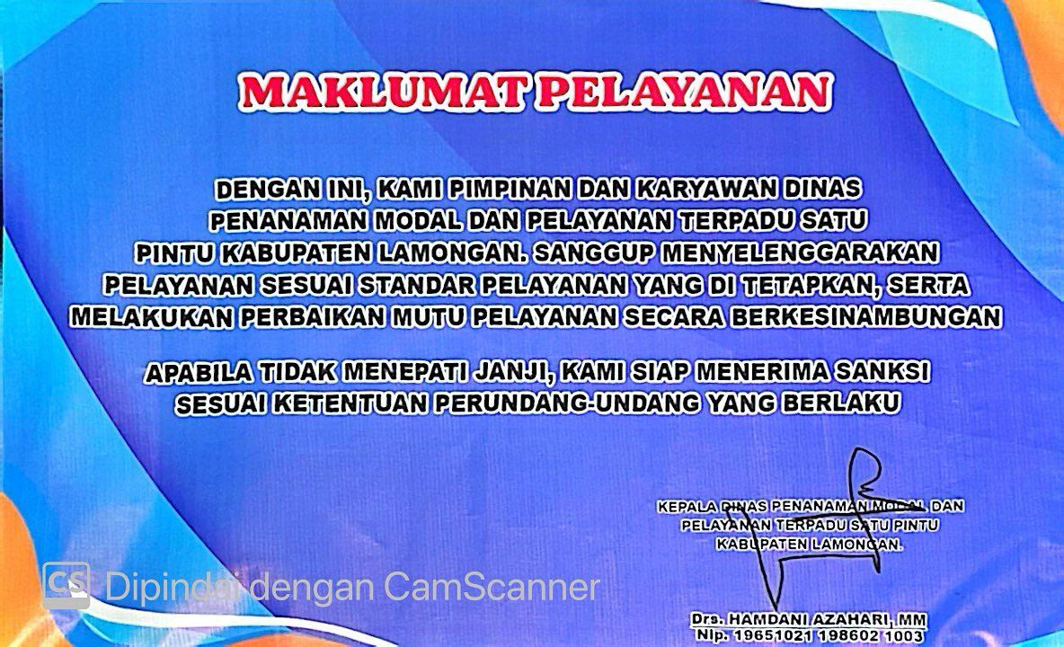Komitmen kami untuk memberikan pelayanan terbaik sesuai standar yang telah ditetapkan. DPMPTSP Kabupaten Lamongan siap melayani, berinovasi dan terus memperbaiki mutu pelayanan secara berkelanjutan.