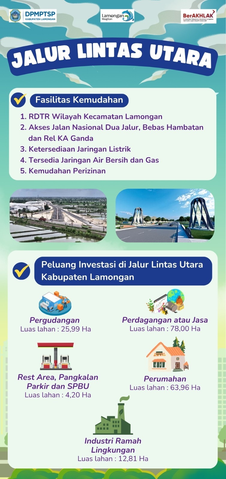 Jalur Lintas Utara Lamongan merupakan koridor strategis yang menghubungkan wilayah barat dan timur Jawa Timur serta menjadi jalur utama distribusi barang dan jasa. Kawasan ini memiliki potensi besar untuk pengembangan sektor industri, pergudangan, perdagangan barang dan jasa, perumahan dan rest area. Dengan dukungan infrastruktur memadai dan kemudahan perizinan dari DPMPTSP Lamongan, Jalur Lintas Utara siap menjadi lokasi investasi unggulan di Pantura Jawa Timur.