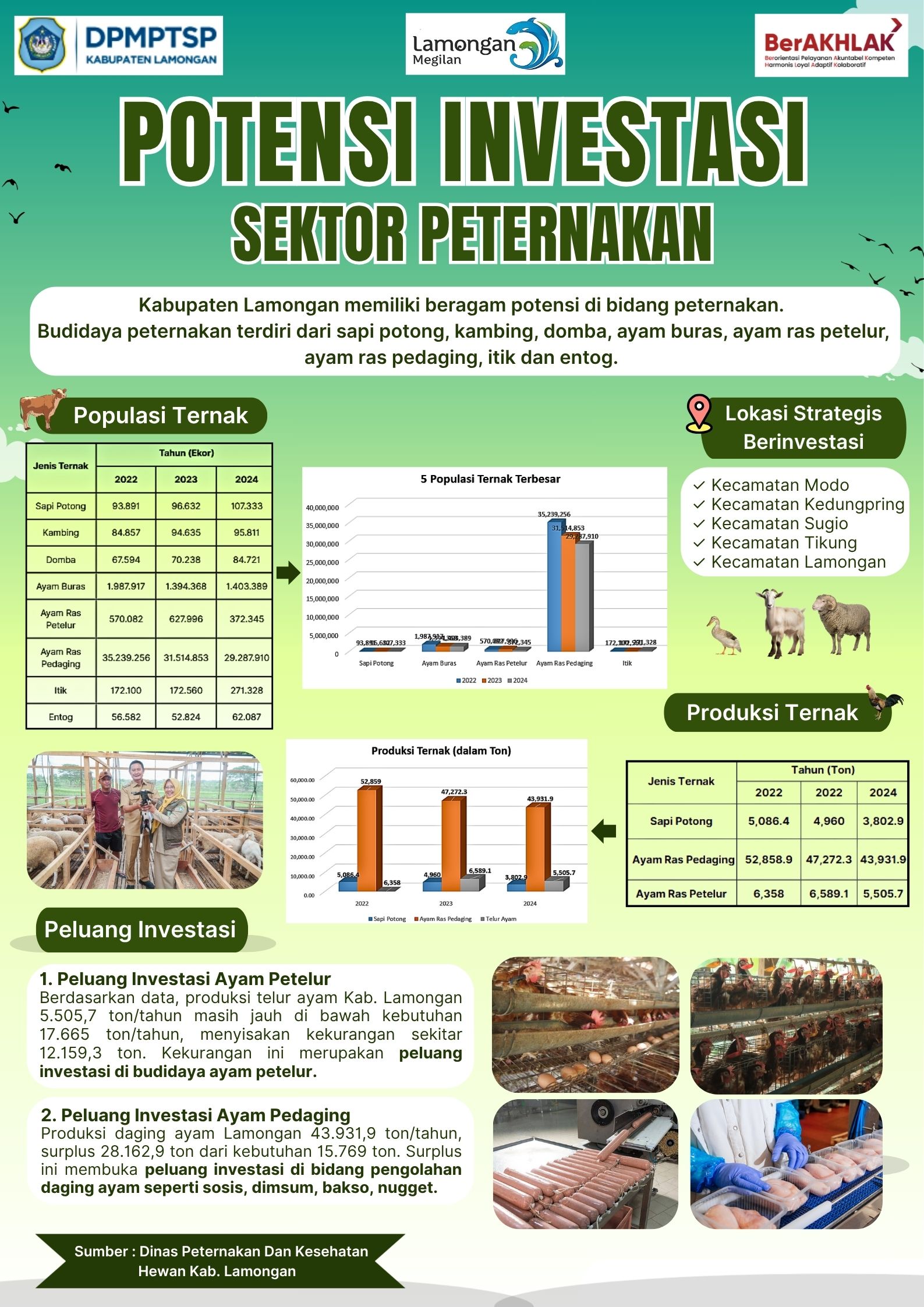 Peluang investasi di sektor peternakan Kabupaten Lamongan sangat potensial dengan dukungan lahan yang luas, ketersediaan pakan ternak, serta iklim yang mendukung pengembangan berbagai jenis ternak. Lamongan dikenal sebagai salah satu sentra peternakan di Jawa Timur dengan komoditas unggulan seperti sapi potong, ayam petelur, ayam pedaging, dan kambing. Potensi pasar produk peternakan yang terus meningkat membuka peluang besar bagi investor untuk mengembangkan usaha peternakan modern, industri pakan, hingga pengolahan hasil ternak. Pemerintah daerah juga memberikan dukungan berupa kemudahan perizinan, peningkatan sarana produksi, dan pendampingan teknis guna menciptakan iklim investasi yang kondusif dan berkelanjutan.